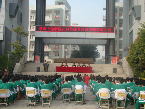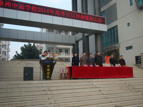 2月26日下午,泉州中遠(yuǎn)學(xué)校2014屆高三年級(jí)舉行了高考百日誓師動(dòng)員大會(huì)。校領(lǐng)導(dǎo)及高三全體師生共同見證了這一令人振奮的時(shí)刻! 王芳玉老師代表高三全體教師鄭重宣誓:“我們將精誠(chéng)團(tuán)結(jié),言傳身教,愛生如子;我們將刻苦鉆研,精心備課,完善教學(xué)方法;我們將隨時(shí)關(guān)注高考動(dòng)態(tài),采集最新高考信息,及時(shí)調(diào)整應(yīng)考策略。” 接著,高三文科班、理科班學(xué)生代表分別上臺(tái)表達(dá)了信心和決心。他們的誓詞似春雷,似戰(zhàn)鼓,精神奮發(fā),豪情萬丈。他們表示,“學(xué)校領(lǐng)導(dǎo)的關(guān)懷是對(duì)我們前程與未來的美好祝愿,老師們的耐心是鼓勵(lì)我們前進(jìn)的不竭動(dòng)力,我們是中遠(yuǎn)學(xué)子,我們要以刻苦拼搏的精神,以更優(yōu)異的高考成績(jī)譜寫母校的榮光。” 王延興校長(zhǎng)勉勵(lì)學(xué)生志存高遠(yuǎn),銳意進(jìn)取,堅(jiān)定信心,準(zhǔn)確定位,鎖定目標(biāo),科學(xué)安排,提高效率;以敏銳的觀察能力,勇敢的探索精神,嚴(yán)謹(jǐn)?shù)乃季S方式,健康的心理素質(zhì),永不言敗的壯志豪情來奮戰(zhàn)100天,智取高考這座高山。