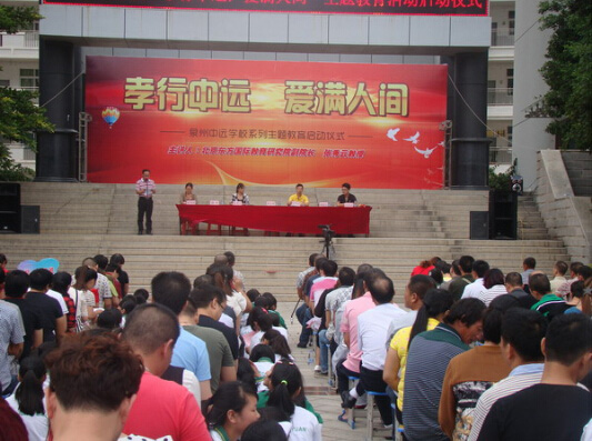 秋陽高照暖乾坤,“孝行中遠”遐邇聞。2015年10月30日,美麗的泉州中遠學校隆重舉行了一場凝聚正能、凈化心靈、催人奮進、別開生面的“孝行中遠,愛滿人間”主題教育活動啟動儀式。數百名學生家長及嘉賓應邀參加,海峽都市報親臨采訪報道。本次活動由泉州中遠學校黨支部副書記、政府督導專員吳偉鴻主持,泉州中遠學校校長黃金盾宣讀行孝主題倡議書,北京東方國際教育研究院副院長張秀云教授主講。 中國青少年研究中心委員、當代中國最具影響力的教育專家與演講家張秀云教授,圍繞“踐行孝道 傳承美德”之主題,選取慈母咬指滴血救兒、割皮救子,博士兒子悔悟跪謝母恩等多個富有教育意義的典型性、代表性的事例進行生動講述,多角度啟迪學生要學會正確認識“舍生取義”的抉擇,要懂得感恩,學會尊重,學會珍愛,學會惜福,要牢記“兒不嫌母丑,狗不嫌家貧”之古訓。張教授生動有趣、通俗易懂、催人淚下、促人醒悟的質樸語言贏得在場家長、嘉賓和師生的陣陣掌聲,現場氣氛濃烈,氣息和諧,回味無窮,刻骨銘心。 “樹欲靜而風不止,子欲養而親不待。” 張教授呼吁大家“行孝”要趁早,這是人生不能等的第一件大事。“爸爸,我愛您!”、“媽媽,我愛您!”、“爸爸、媽媽,您們辛苦啦!我們永遠愛您敬您!不再讓您操心了!”這是學子們在孝道正能量的感召下喊出的時代強音,音律回旋,扣人心弦,響徹文都,回蕩中遠。親子互動現場,一對對母子、父子深深擁抱的瞬間,撥動著心靈的琴弦,凈化了思想,溫暖了心田。藍天印證,大地印證! “一個尊師重教的民族才是有希望的民族”,張教授還將“行孝”的內涵延伸至踐行尊師重教這一美德,呼吁家長和孩子要尊重老師,尊重知識,知恩報恩。在張教授的倡導下,全場家長和孩子紛紛走到主席臺前與班科任老師親切握手、擁抱,隨后全場齊聲高喊:“老師,您辛苦啦!” 孩子“行孝”落實到生活中就是要學會擔當。“好孩子從做家務開始”,為增強本次主題教育的有效性和針對性,家長和孩子紛紛參與簽字儀式,以示落實“敬、靜、凈、鏡、競”這“五項教育”的決心。 與會學生家長一致認為,愛孩子不能慣孩子,“慣子如殺子”,作為家長要有效監督孩子的行為表現,科學引領孩子朝正確的人生軌道穩步發展,讓孩子在和諧與幸福的環境中健康、快樂地成長。同時要有效搭建家校互動平臺,促進溝通與交流。 “我努力,我堅持,我能行,我必行!”學子們也表示要以此為契機,積極響應學校的“行孝”主題倡議活動,“讀好書,做好人,敢擔當,行孝恩”。 據悉,為推進孝道文化傳播,彰顯中遠德育特色,學校將以系列主題教育活動為依托,分階段抓關鍵,重落實見成效,著力通過國學研讀、經典吟誦、主題班會、板報宣傳、演講比賽、征文比賽、孝歌大賽、劇本演出、家校互動、家務勞動、評選“孝行中遠”標兵等形式,豐富行孝教育主題,注重開發與利用德育資源,多方位滲透德育元素,極力打造“互聯網+智慧中遠”教育精品,進一步提升校園精神文明建設內涵,全面落實教育科學發展觀和社會主義核心價值觀。