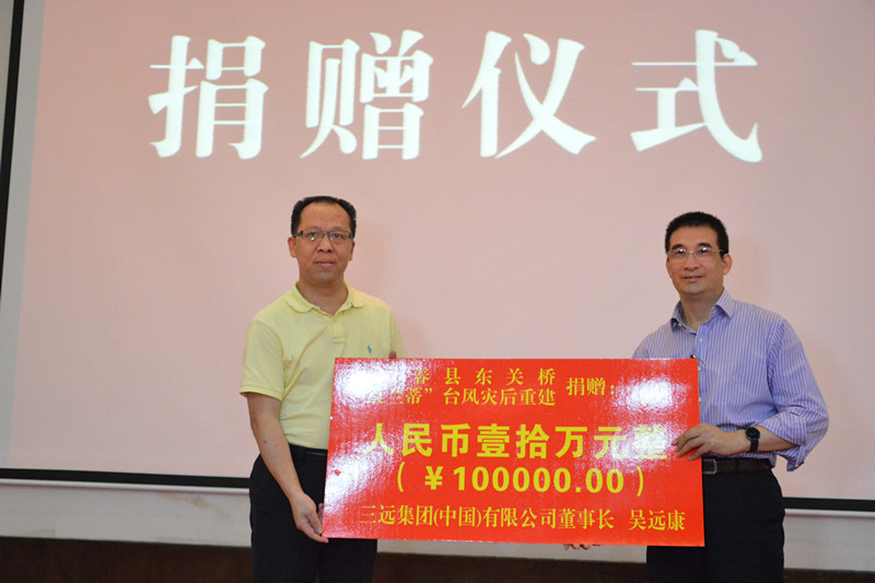 5月11日,泉州市僑商會(huì)一屆四次會(huì)議在永春北溪召開,三遠(yuǎn)集團(tuán)董事長(zhǎng)、泉州市僑商會(huì)執(zhí)行會(huì)長(zhǎng)吳遠(yuǎn)康及泉州市各縣(市)區(qū)僑聯(lián)領(lǐng)導(dǎo)等70余人出席。在當(dāng)日會(huì)議舉行的捐贈(zèng)儀式上,吳遠(yuǎn)康先生捐贈(zèng)人民幣10萬(wàn)元用以支持在“莫蘭蒂”臺(tái)風(fēng)中損壞的永春東關(guān)橋?yàn)?zāi)后重建工作。 會(huì)議當(dāng)天,吳遠(yuǎn)康先生代表泉州市僑商會(huì)通報(bào)2016年工作情況,并就下一階段工作進(jìn)行規(guī)劃。據(jù)介紹,泉州市僑商會(huì)自2012年成立以來,開展多次公益慈善活動(dòng),僅在“莫蘭蒂”臺(tái)風(fēng)災(zāi)后重建過程中,泉州僑商會(huì)會(huì)員便向?yàn)?zāi)區(qū)捐贈(zèng)600多萬(wàn)元,多年努力下,泉州市僑商會(huì)已成為泉州本土一個(gè)獨(dú)具特色的商會(huì)組織,一個(gè)富有生機(jī)活力的“僑字號(hào)”民間社團(tuán)。