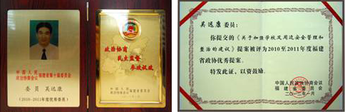 集團(tuán)董事長、總裁吳遠(yuǎn)康先生當(dāng)選2010-2011年度福建省政協(xié)優(yōu)秀委員,其《關(guān)于加強學(xué)校及周邊安全管理和整治的建議》榮獲2010-2011年度福建省政協(xié)優(yōu)秀提案