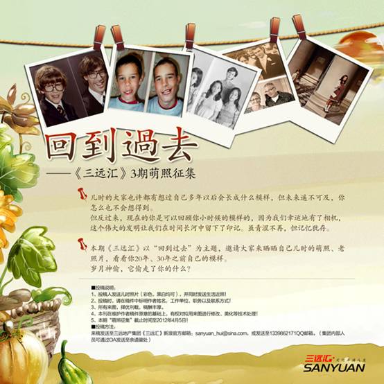 兒時的大家也許都有想過自己多年以后會長成什么模樣,但未來遙不可及,你怎么也不會想得到。 但反過來,現在的你是可以回顧你小時候的模樣的,因為我們幸運地有了相機,這個偉大的發明讓我們在時間長河中留下了印記。雖青澀不再,但記憶猶存。 本期《三遠匯》以“回到過去”為主題,邀請大家來曬曬自己兒時的萌照、老照片,看看你20年、30年之前自己的模樣。 歲月神偷,它偷走了你的什么? 投稿說明:1、每人應提供不少于2張的兒時老照片(彩色、黑白均可)及生活近照! 投稿時,請在稿件中標明作者姓名,工作單位、職務以及聯系方式! 所有來圖,擇優刊載,稿酬豐厚! 本刊在維護作者稿件原意的基礎上,有權對擬用來圖進行修改、美化等技術處理! 本期“萌照征集”截止時間至2012年4月6日! 投稿方法:來稿發送至三遠地產集團《三遠匯》新浪官方郵箱:sanyuan_hui@sina.com,或發送至1339862171QQ郵箱。(集團內部人員可通過OA發送至余道鋆處) 《三遠匯》3期萌照征集海報