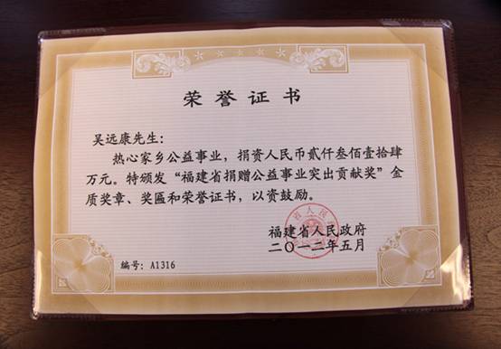 吳遠(yuǎn)康先生榮獲“福建省捐贈公益事業(yè)突出貢獻(xiàn)獎”榮譽(yù)證書